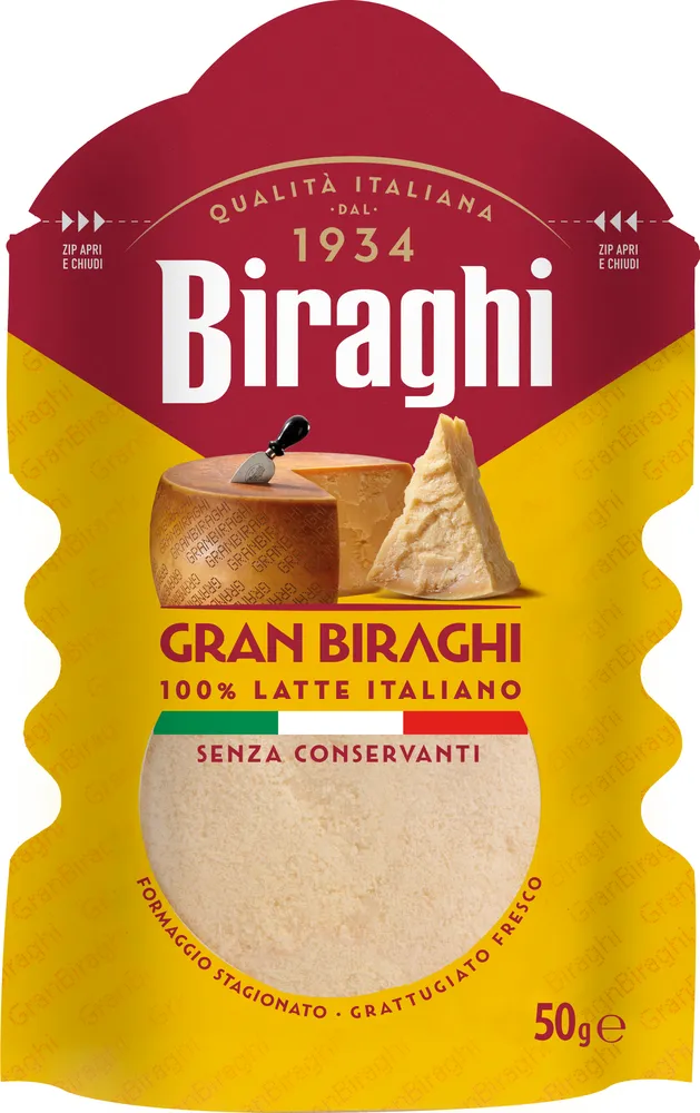 Gran Biraghi är en italiensk ost av grana-typ vilket innebär att den räknas till samma ostfamilj som Grana Padano och Parmigiano Reggiano. Den har sitt ursprung i den lilla staden Cavallermaggiore i regionen Piemonte. Gran Biraghi är lagrad minst 12 månader innan den rivs fint. Smaken är fyllig och umamistinn med en fin eftersmak och den är perfekt att strö över pasta, grönsaker, i risotto eller att använda som gratängost.