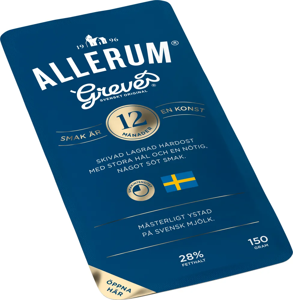 Allerum Grevé skivad hårdost 150g med 28% fetthalt som långlagrats i 12 månader, vilket gör den extra rund och fyllig. Aromrikedomen och den sötaktiga nötkaraktär gör den till en generös ost som passar lika bra på mackan som på ostbrickan . Smaka och upplev vad tid, kunnande och kärlek kan göra. Njut av tiden!