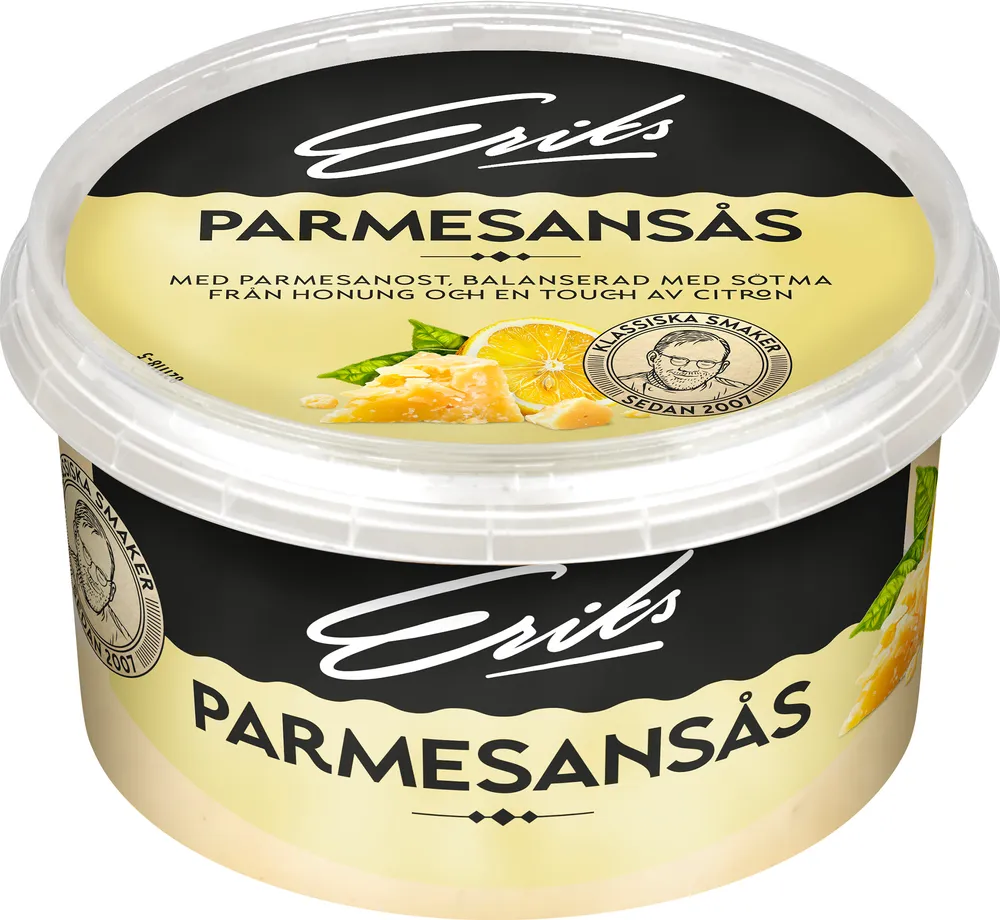 Eriks Parmesansås med äkta parmesanost – Parmigiano-Reggiano, balanserad med sötma från honung och en touch av citron. Är en härligt krämig sås med den tydliga sältan och smaken från parmesanosten. Tips: Eriks Parmesansås är som gjord för att serveras till kalvkött, kyckling och halstrad lax. Men självklart även till det mest italienska som finns: pastarätter i alla dess former. Testa en klick till perfekt al dente pasta för en härlig, lyxig smak.