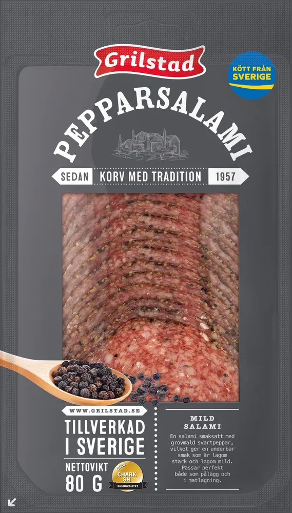 Grilstad Pepparsalami är smaksatt med grovmald svartpeppar, vilket ger en underbar smak som är lagom stark och lagom mild. Salami som passar perfekt både som pålägg och i matlagning.