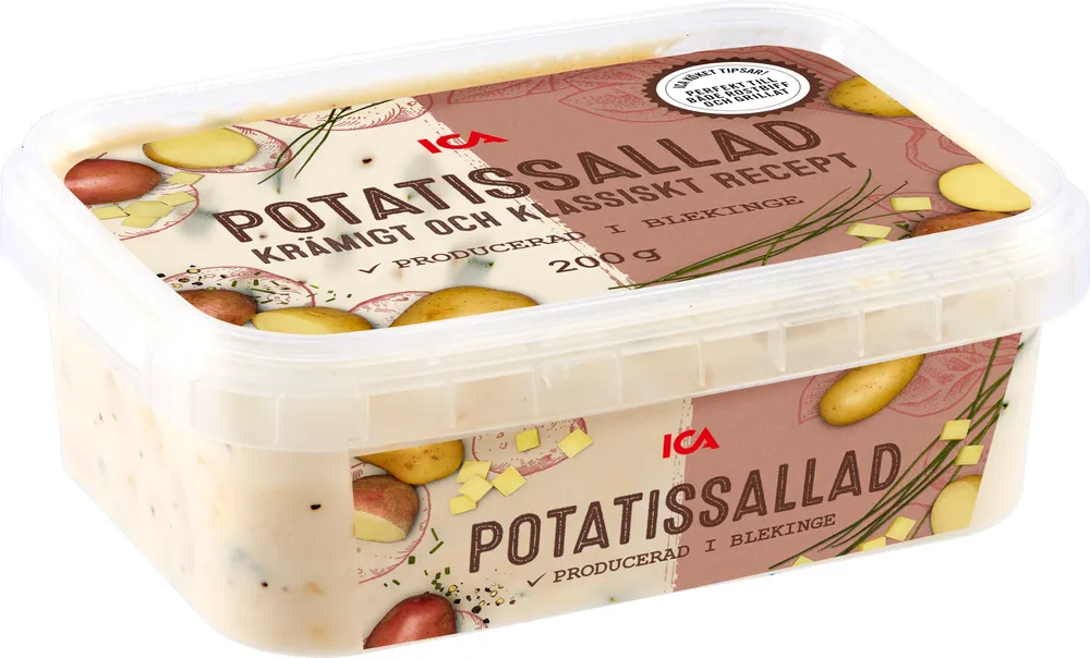 Ingredienser: Kokt potatis 68%, majonnäs (rapsolja, vatten, äggula, modifierad stärkelse (majs, potatis), ättika, socker, konserveringsmedel (E202, E211), salt, stabiliseringsmedel (E401), surhetsreglerande medel (E330)), lök, gräslök, salt, citronjuice från koncentrat (vatten, citronjuice konserveringsmedel (E224)), svartpeppar.