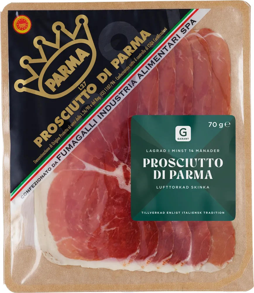 Prosciutto di parma lagrad i minst 13 månader. Lufttorkad enligt italiensk tradition. 70 gram.