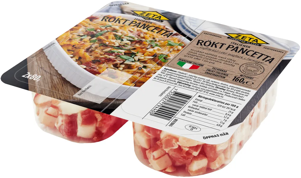 Zeta Rökt Pancetta, sidfläsk som kryddats och rökts lätt med bokträ. Passar utmärkt i en Spaghetti Carbonara, mustig gryta eller i en paj.