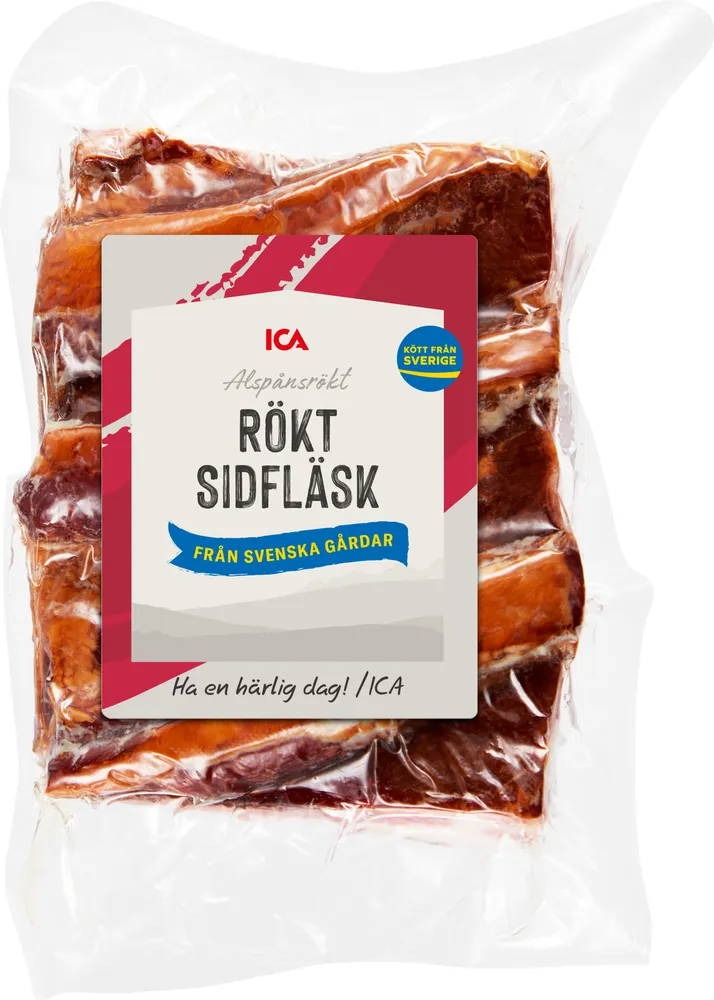 Rökt sidfläsk i bit tillverkas av ICA.