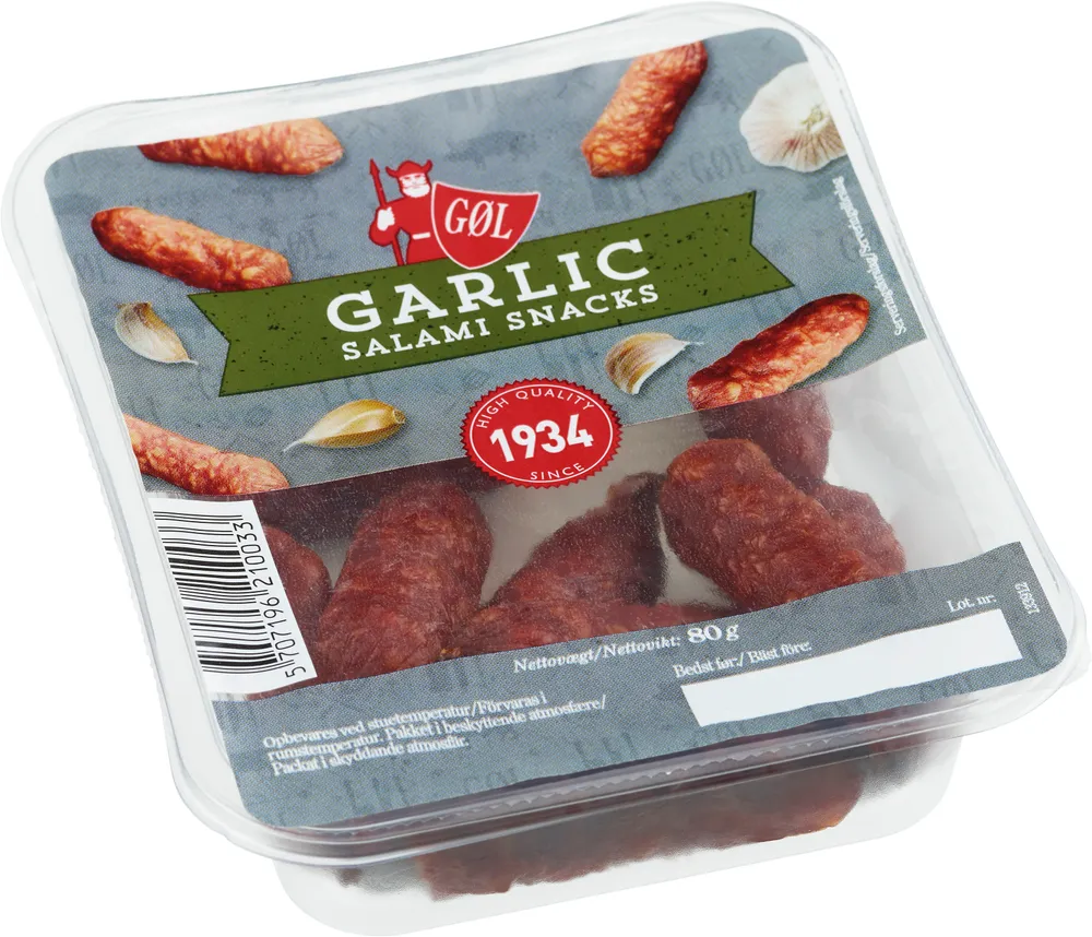 Göl Garlic Salami Snacks är tilltugg för dig som älskar ölkorv. Ett perfekt snacks när magen kurrar under matlagningen. En fin och god salami i vår klassiska smak, som ofta blir mångas storfavorit både på utflykten och tapasbrickan.