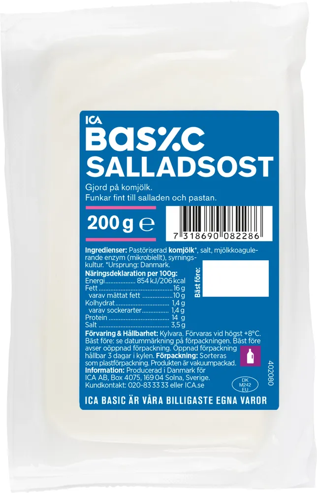 Ingredienser: Pastöriserad KOMJÖLK*, salt, mjölkkoagulerande enzym (mikrobiellt), syrningskultur. *Ursprung: Danmark.