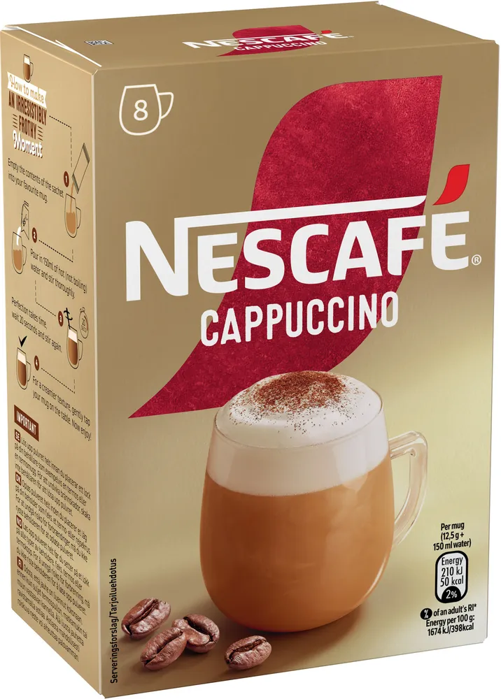 Nescafé Cappuccino, Snabbkaffe, 8 x 12.5g Portionspåsar. Njut av en Cappuccino i kaféstil på bara några sekunder.