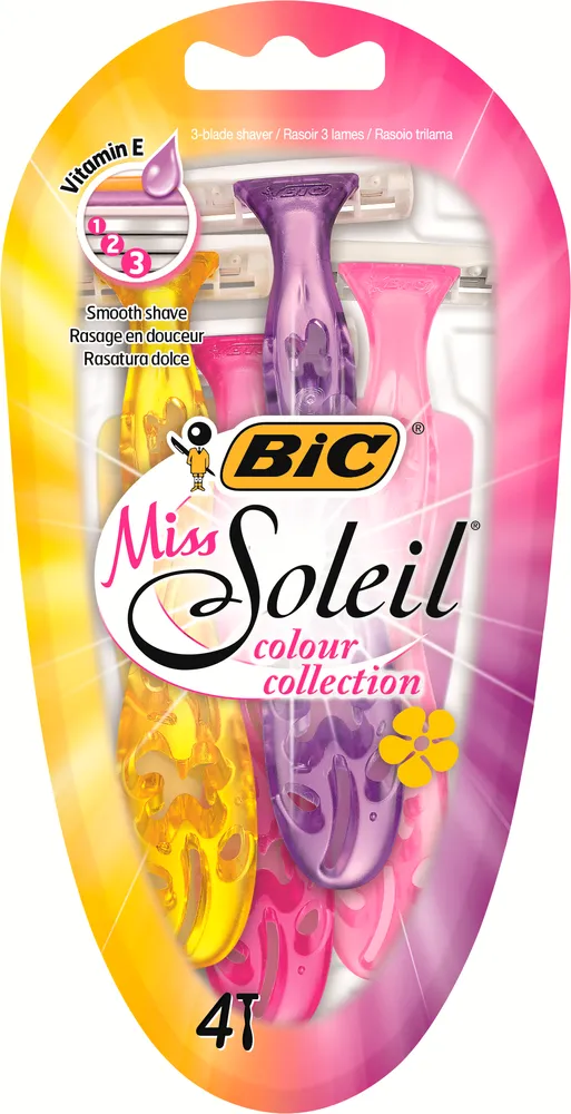 Gör rakningen till ett rent nöje med 3-bladiga rakhyveln BIC Miss Soleil Colour Collection, särskilt utformad för kvinnor med fina graverade blommor på handtaget i 2 rosa nyanser, samt gult och lila. Den har en mjukgörande remsa, berikad med vitamin E, som ger bra glid och en smidig rakning på ben, i armhålor och bikiniområdet. Ett fast huvud och 3 blad i rostfritt stål av högsta kvalitet ger hållbarhet och kontroll.