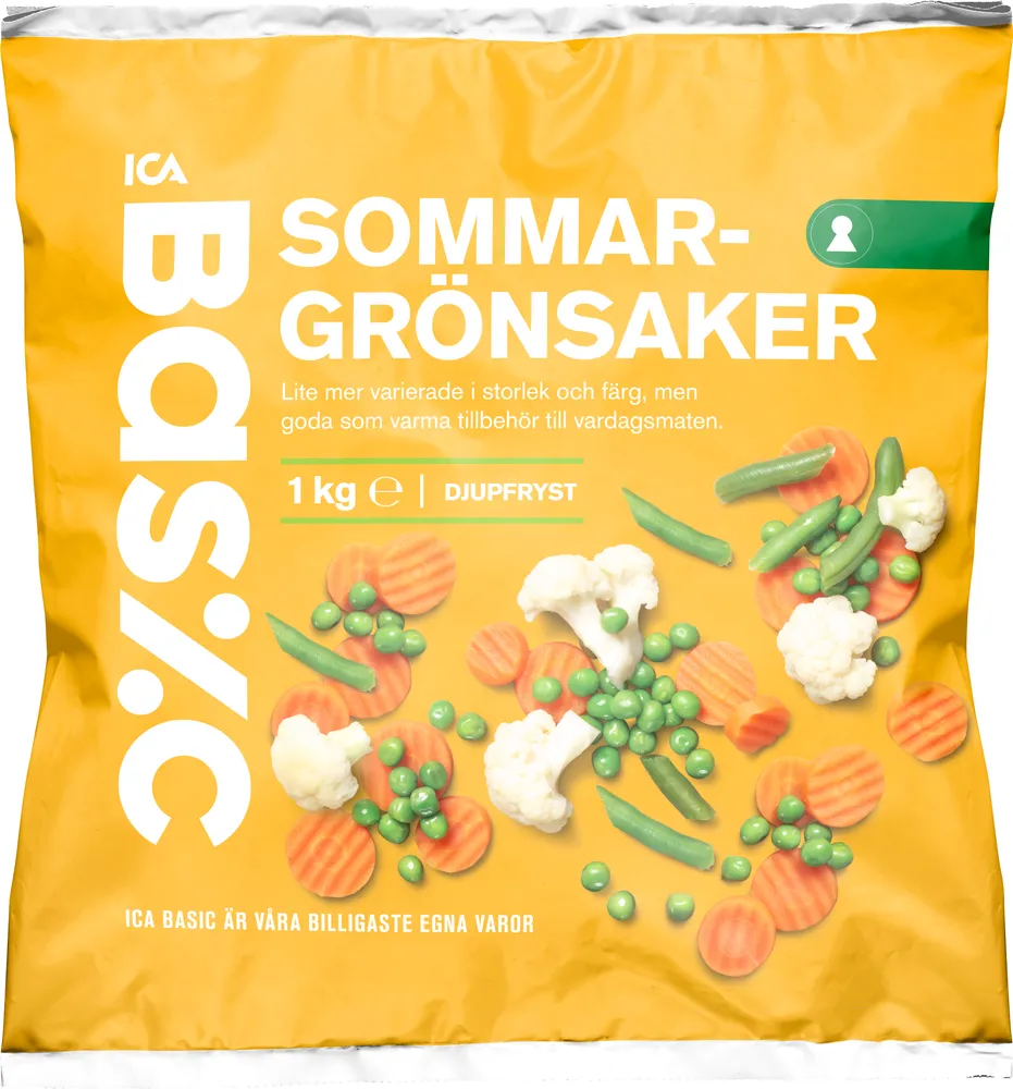 Sommargrönsaker tillverkas av ICA Basic.