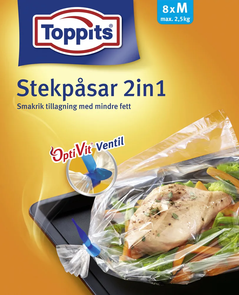 Toppits® Stekpåsar 2in1 med OptiVit®Ventil för perfekt tillagning. Stekpåsen gör maten extra saftig och inget fett behövs tillsättas. Dessutom har påsen en kall sida som gör att du inte bränner fingrarna. Tack vare stekpåsen förblir ugnen ren