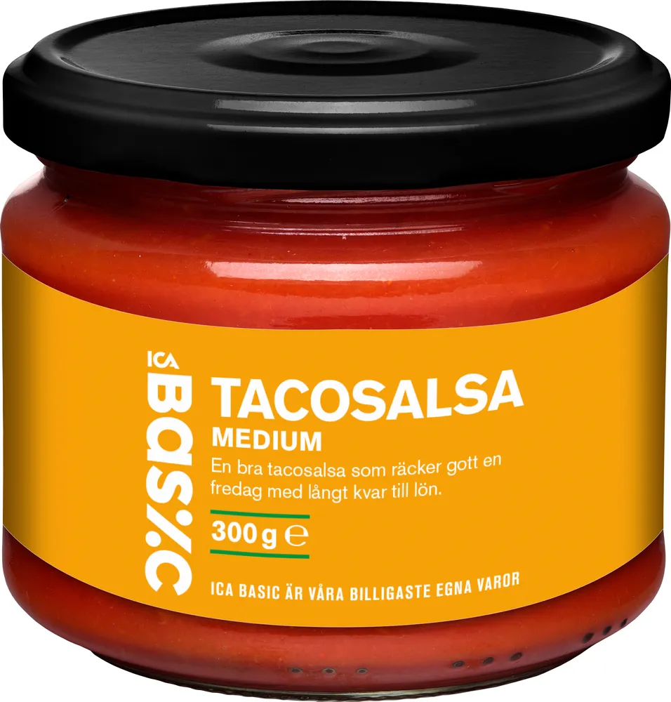 Tacosalsa medium tillverkas av ICA Basic.