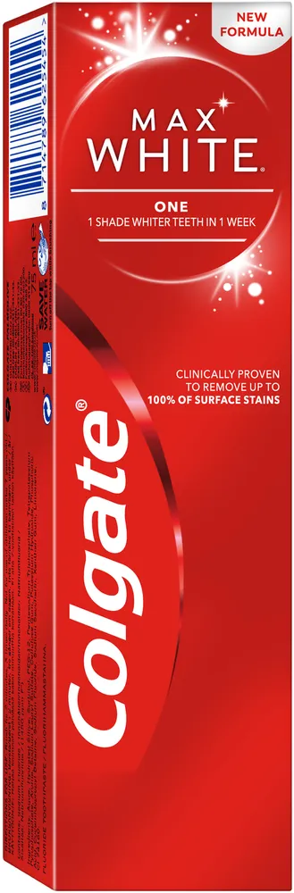 Colgate Max White One tar bort upp till 100% av ytliga missfärgningar på tänderna och ger en nyans vitare tänder på 1 vecka. Fluorinnehåll: 1450 ppm.