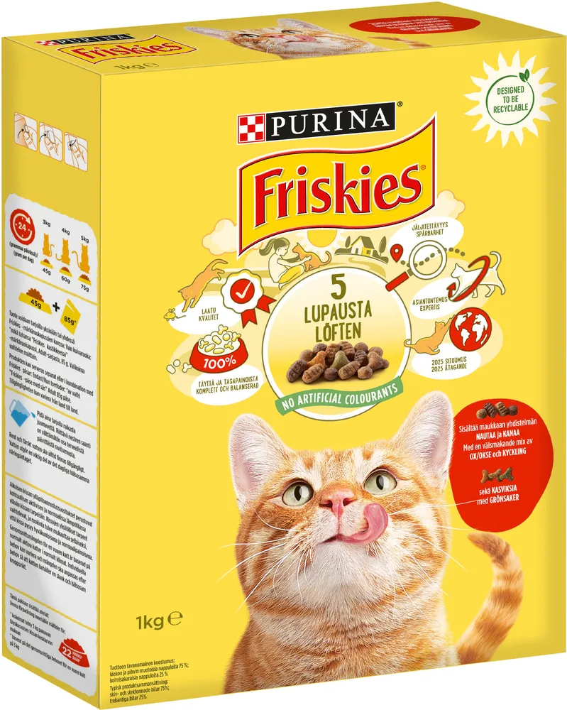 Våra katter är naturliga utforskare och medvetna om allt i sin omvärld. Det är det som gör dem till sådana fascinerande medlemmar av familjen och ger liv till våra hem. Därför har Purinas experter skapat Friskies® för vuxna katter: välsmakande kattfoder av högsta kvalitet för att ge näring åt din utforskares oändliga intresse för sin omvärld. Inga tillsatta, konstgjorda färgämnen, smakämnen eller konserveringsmedel Friskies® har producerat välsmakande och nyttig näring för katter i årtionden. Vi fyller miljontals matskålar och med denna ära följer stort ansvar. Därför innehåller Friskies® recept inga tillsatta, konstgjorda färgämnen, smakämnen eller konserveringsmedel. Så du kan stolt fortsätta att ge din katt samma välsmakande mat den älskar.
