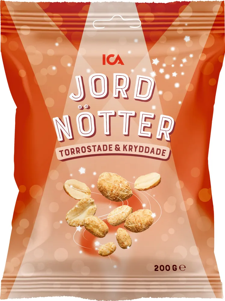 JORDNÖTTER* 94%, salt, VETEMJÖL, geleringsmedel (E414), stabiliseringsmedel (E420), potatisstärkelse, jästextrakt, arom, kryddor (paprika), lökpulver, färgämne (E160c), kryddextrakt (gurkmeja). Kan innehålla spår av cashewnötter, mandel, hasselnötter, pistagenötter, pekannötter, macadamianötter, paranötter, valnötter. *Odlat i Argentina/Brasilien/USA.