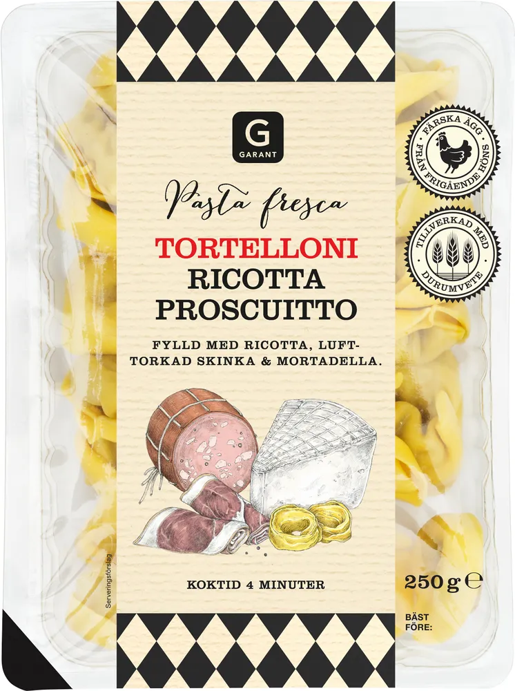 Färsk tortelloni fylld med ricotta, lufttorkad skinka och mortadella. Tillverkad med durumvete och färska ägg. 250 gram.