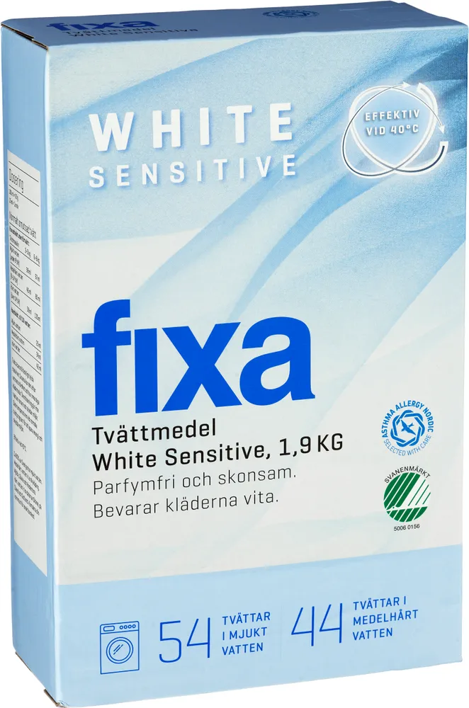 Tvättmedel sensitive white tillverkas av Fixa.