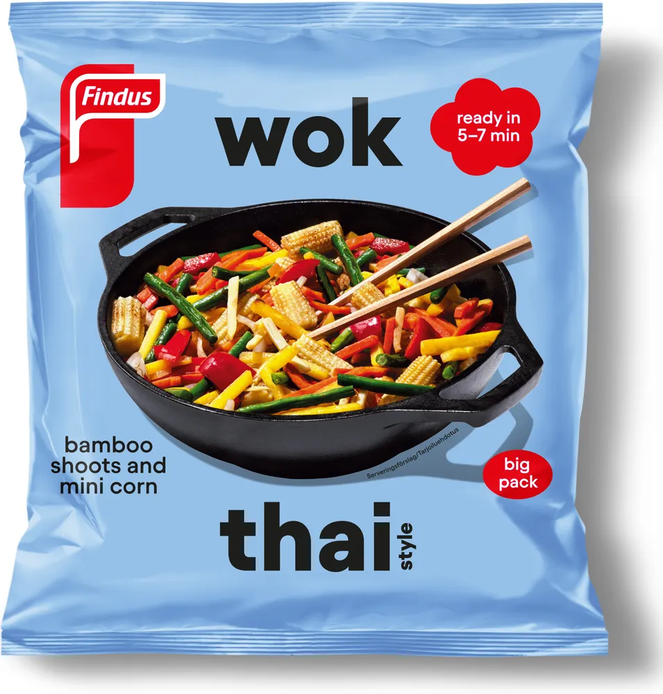 Findus WOK Thai Style är en exotisk grönsaksmix med inspiration från Asien som innehåller bl.a. bambuskott, bönor, paprika och min majs. WOK-grönsakerna kan tillagas snabbt i en het panna eller i mikron. Servera en vegetarisk variant med nudlar, ris eller tillsätt ett valfritt protein. Snabbt, gott, hälsosamt och perfekt till vardags!