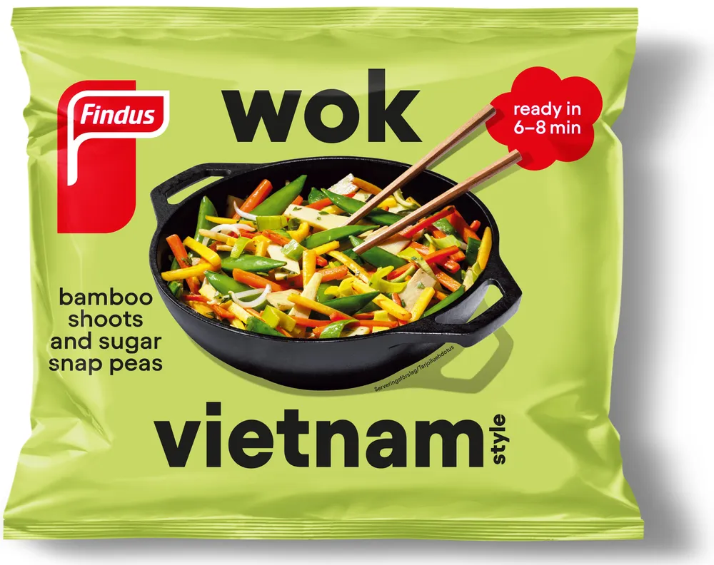 Findus WOK Vietnam Style är en fräsch och färgglad wokblandning av tunt skivade grönsaker. Innehåller t.ex. bambuskott och sockerärter. WOK-grönsakerna går snabbt att tillaga i en het panna eller i mikron. Servera en vegetarisk variant med nudlar eller lägg till ett valfritt protein. Snabbt, gott, hälsosamt och perfekt till vardags!