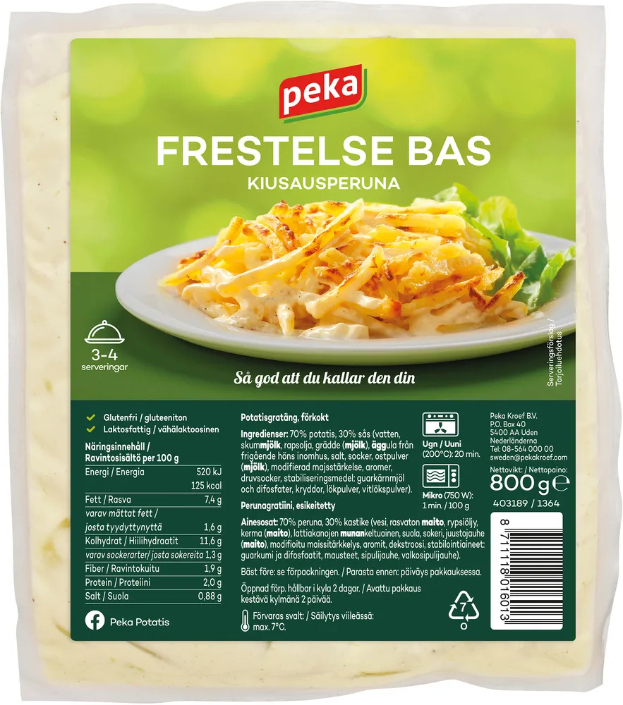 Ingredienser: 70% potatis, 30% sås (SKUMMJÖLK, vatten, rapsolja, grädde (MJÖLK), majsstärkelse, ÄGGULA från frigående höns inomhus, salt, socker, ostpulver (MJÖLK), naturliga aromer, kryddor, vasslepulver (MJÖLK), vitlökspulver, lökpulver).