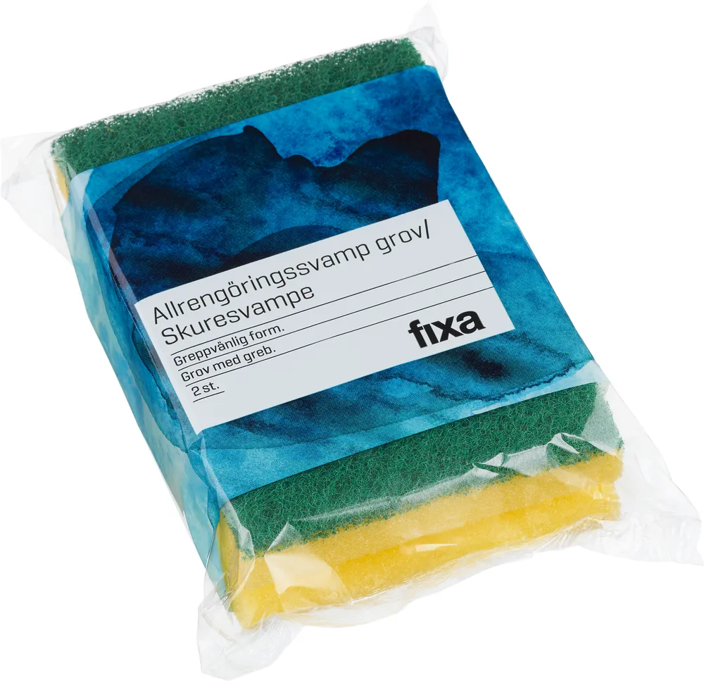 Grov allrengörningssvamp med greppvänlig form. Skrubbyta med slipmedel. 2 stycken.