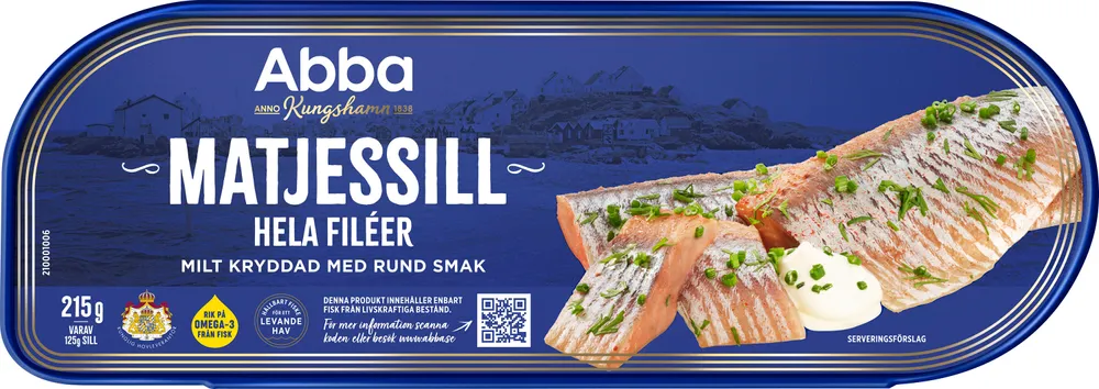 Abba Matjes i hela filéer har en traditionellt rund kryddig smak och är extra omtyckt att använda när man vill göra fina uppläggningar. Varför inte en matjeskrans? Eller lerpottasill? Vår matjes innehåller sill (Clupea harengus) av högsta kvalitet som fiskas i Nordostatlanten och som enbart kommer från livskraftiga bestånd. Sillen får mogna i tunnor med en kryddlag i vårt bergrum i Kungshamn på bohuslänska västkusten tills att den smakar som allra bäst och är redo att njutas av! Matjessill har en given plats vid midsommarfirandet eller äts som den är tillsammans med färsk potatis, gräddfil, gräslök och lite brynt smör. Den här matjesburken är märkt med symbolen lågt klimatavtryck, vill du veta mer? Läs mer på abba.se