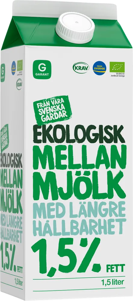 Ekologisk mellanmjölk med längre hållbarhet. Från Svenska gårdar. Fetthalt 1,5%. 1,5 liter.
