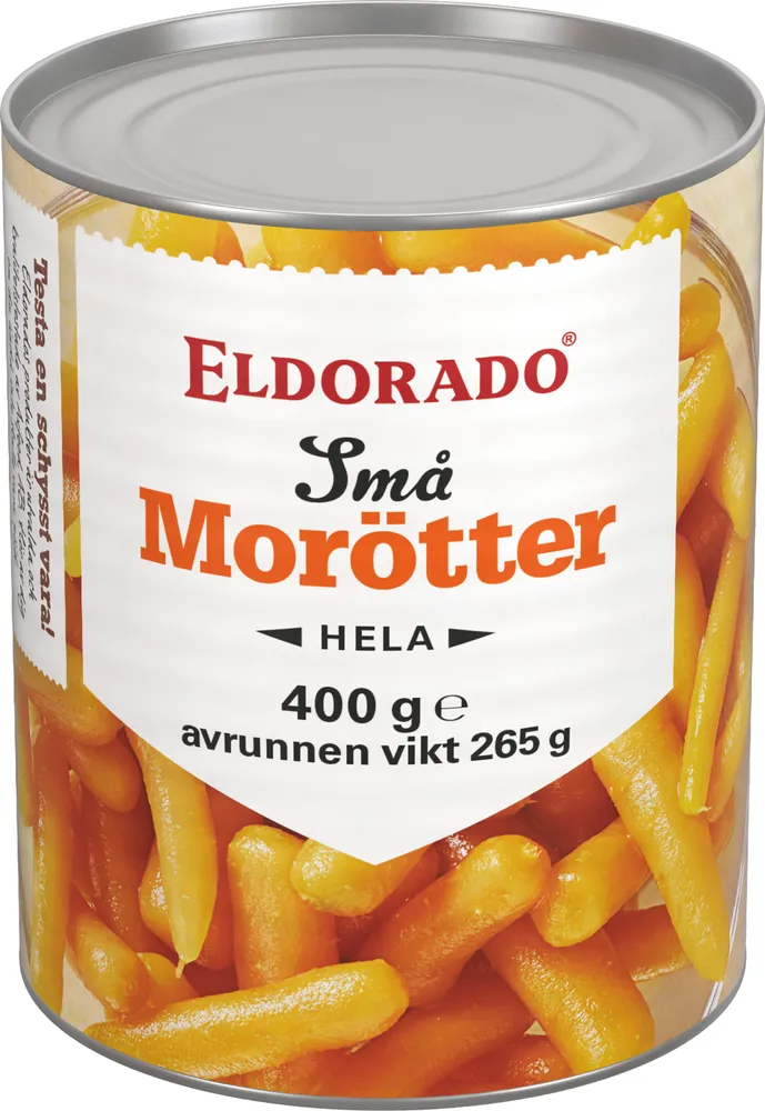 Små hela morötter. 400 gram, avrunnen vikt 265 gram.