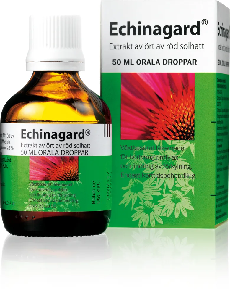 Växtbaserat läkemedel för kortvarig profylax och lindring av förkylning. Endast korttidsbehandling. Röd solhatt har rapporterats stimulera immunförsvaret (makrofagernas fagocytos och aktiviteten hos NK-celler). En studie på Echinagard orala droppar visade att hos personer med förkylningssymtom bröt förkylningen ut mindre ofta hos dem som fick Echinagard droppar jämfört med de personer som enbart fick overksamma droppar. Förkylningen förkortades med i medeltal 4 dagar.