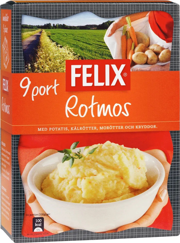 Felix Rotmos är gjord på potatis, kålrot, morot och kryddor. Förpackningen räcker till 9 portioner rotmos. Tillagas snabbt och enkelt i kastrull eller mikro, tillsätt bara vatten till pulvermoset så är du klar. Smaksätt gärna med lite extra svart- eller kryddpeppar. För att läsa mer om Felix produkter besök felix.se