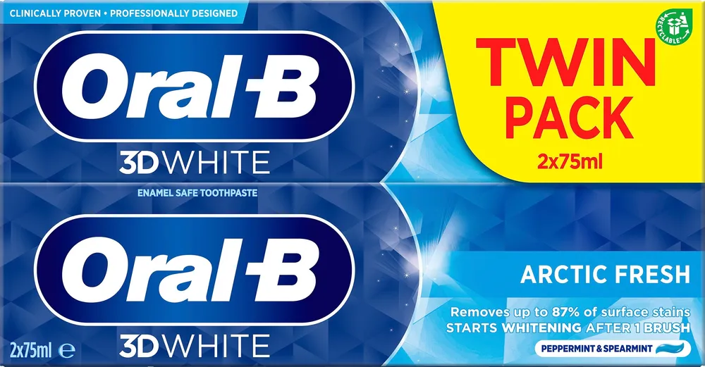 Oral-B 3D White Arctic Fresh tandkräm är kliniskt beprövad, avlägsnar upp till 87 % av ytliga missfärgningar och börjar vitgöras efter 1 borste.